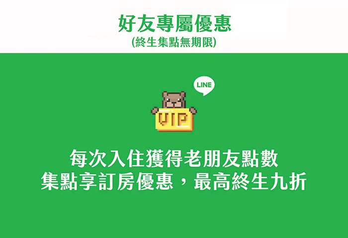 - 會員在官網或與直接聯繫訂房,入住時即可獲得點數,每間房每一晚可獲得1點,最高可累積15點,累積越多點數可享越優惠的房價。